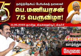 Contact us to Add Your Business அறிவிப்பு: தமிழ்த்தேசியப் பேரியக்கத் தலைவர் பெ.மணியரசன் அவர்களின் 75ஆவது பிறந்தநாள் பெருவிழாப் பொதுக்கூட்டம் (சூன் 11, திருவெறும்பூர் பேருந்து நிலையம் அருகில்) தமிழ்த்தேசியப்